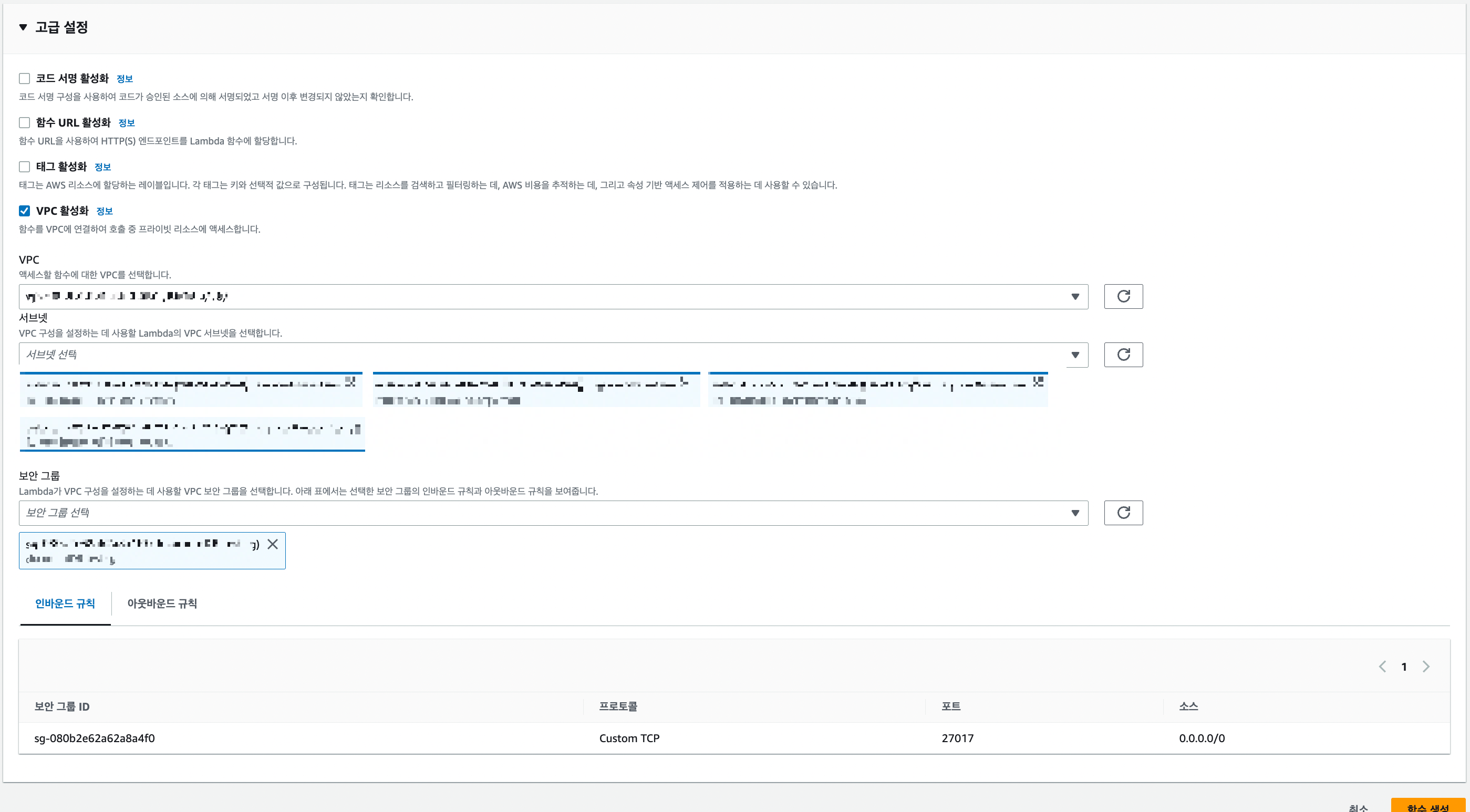 고급 설정 탭을 확장하여 VPC 활성화를 하여 DocumentDB 를 생성한 VPC를 선택하고 DocumentDB 포트가 열려있는 보안그룹을 지정합니다.