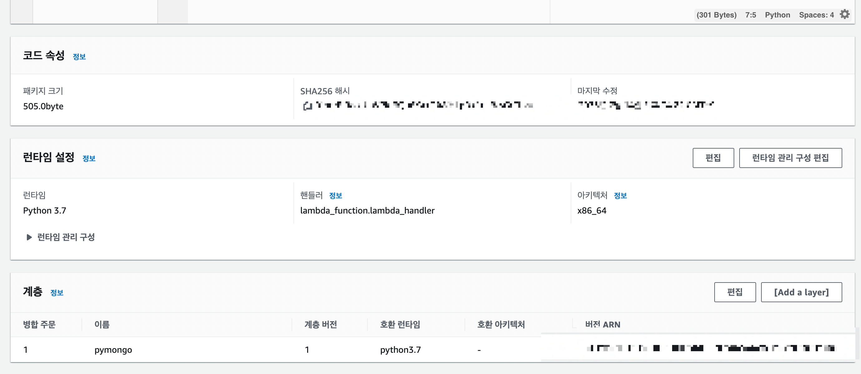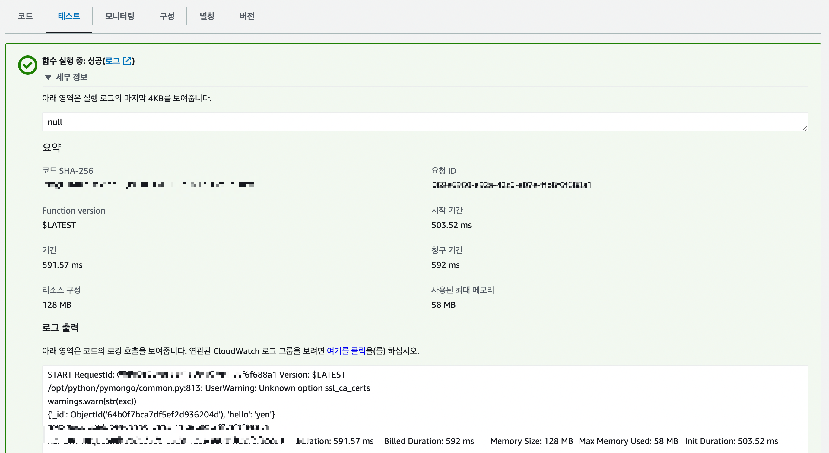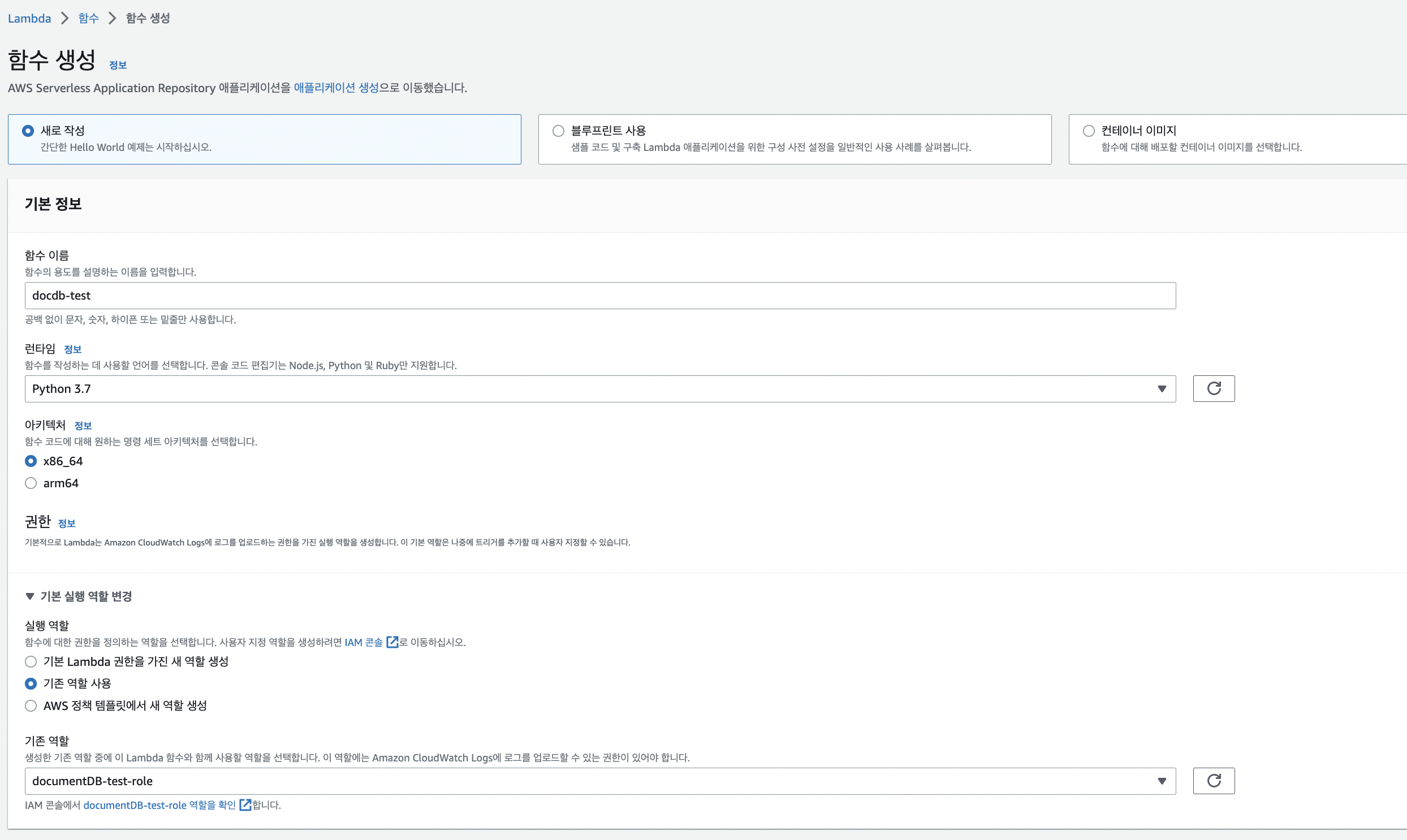 런타임은 python 으로 설정했고 이때 Lambda 생성 시 Lambda에는 DocumentDB 에 액세스할 수 있는 IAM 역할이 필요합니다.