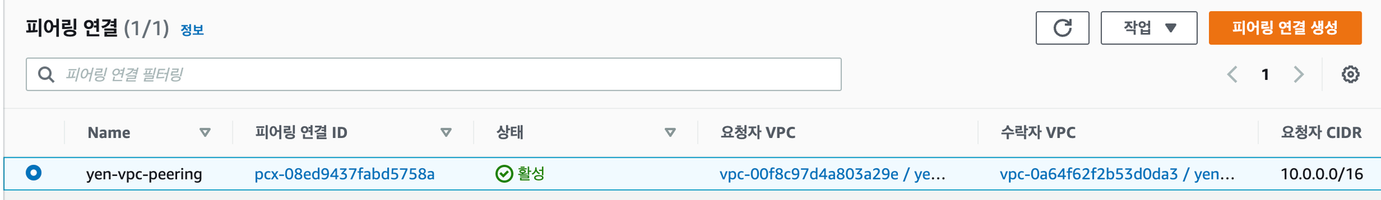 생성이 완료되면 피어링 연결이 잘 된것을 확인할 수 있다.