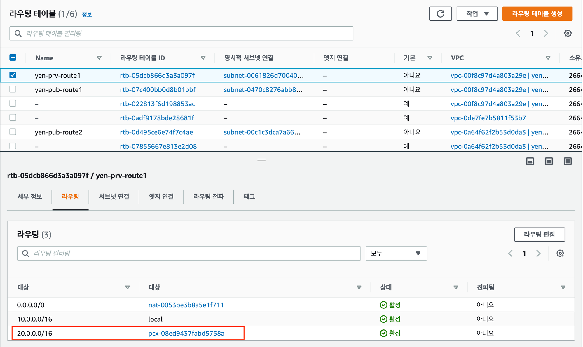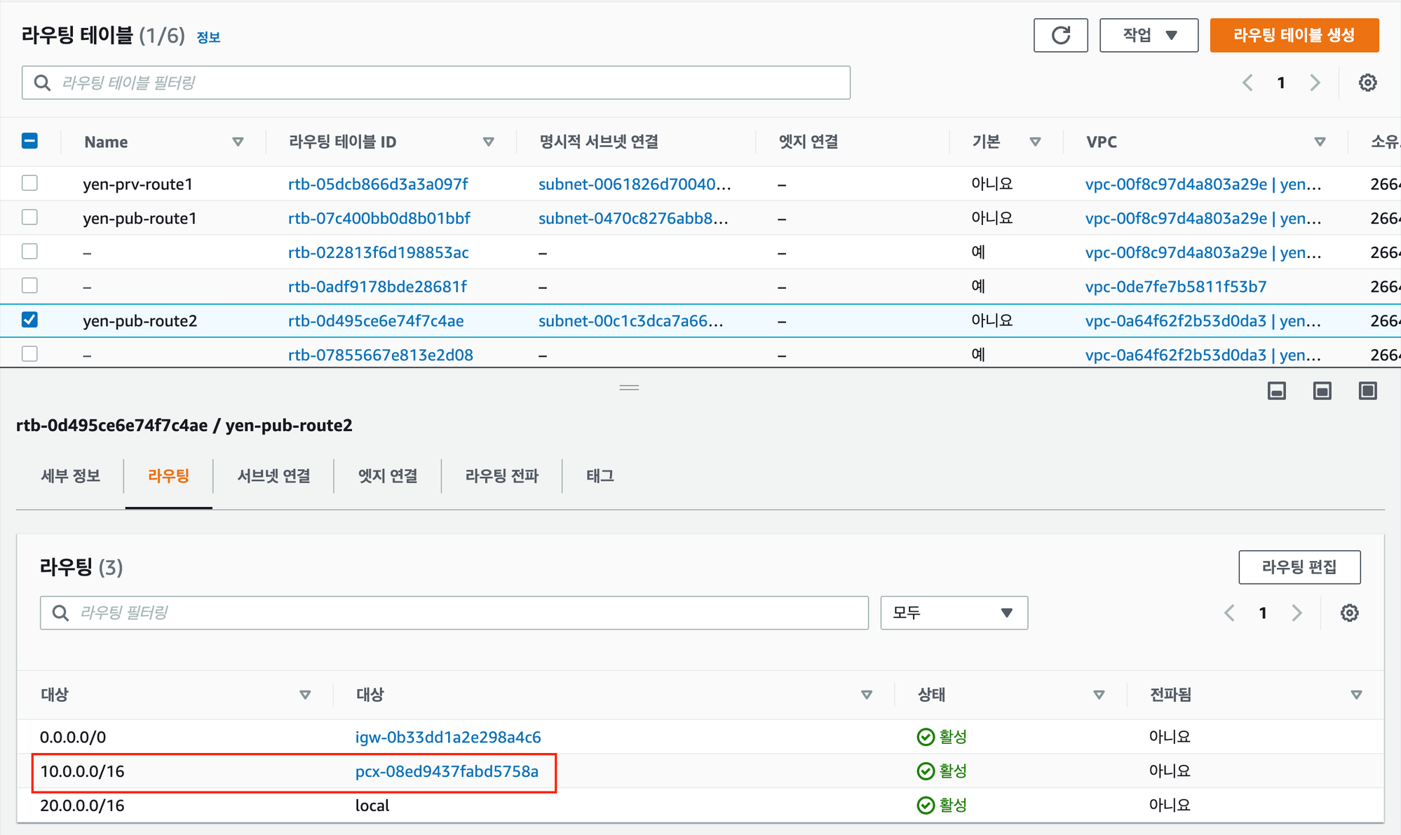 마찬가지로 연결할 yen-vpc2 의 public 서브넷의 라우팅 테이블에 yen-vpc1 대역으로 peering 연결을 추가한다.