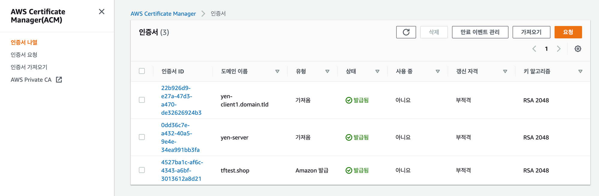 $ aws acm import-certificate --certificate fileb://yen-server.crt --private-key fileb://yen-server.key --certificate-chain fileb://ca.crt $ aws acm import-certificate --certificate fileb://yen-client1.domain.tld.crt --private-key fileb://yen-client1.domain.tld.key --certificate-chain fileb://ca.crt🚨 이때 해당 명령 실행 중 권한 오류가 나온다면 aws configure 명령으로 AWSCertificateManagerFullAccess 권한이 있는 사용자로 자격증명을 설정해주어야한다.