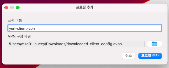 프로필 이름을 입력하고 4단계에서 다운받은 클라이언트 구성 파일을 선택하고 프로필 추가를 완료한다.
