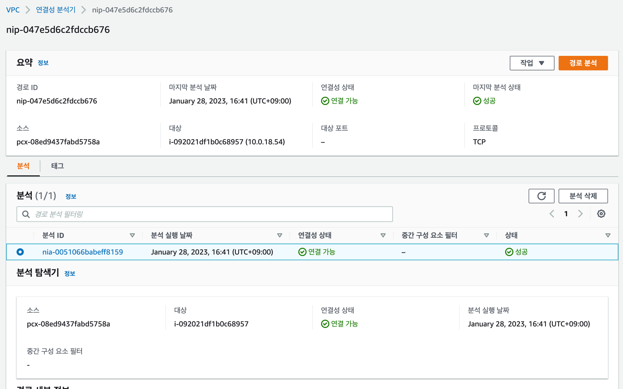 경로 생성 및 분석을 선택하여 위에서 생성한 VPC Peering과 EC2 를 선택하여 분석 경로를 생성한다.