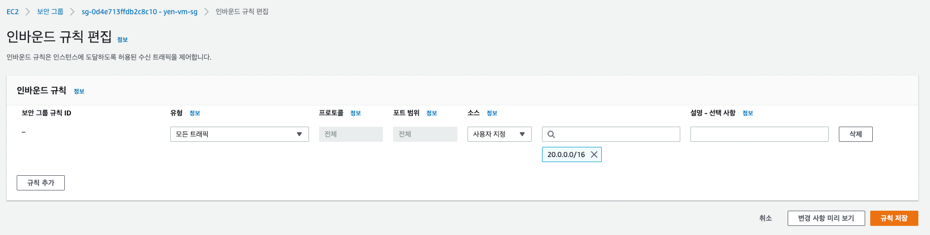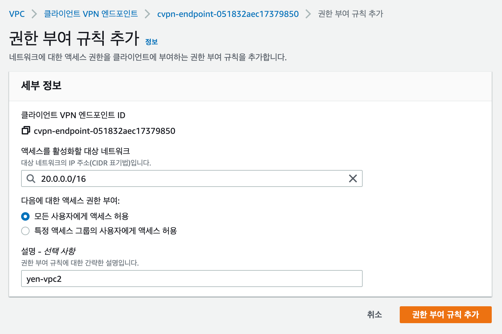 2. 권한 부여 규칙 추가에서 대상 네트워크인 yen-vpc2 의 대역인 20.0.0.0/16 을 모든 사용자에게 액세스 허용으로 추가해준다.