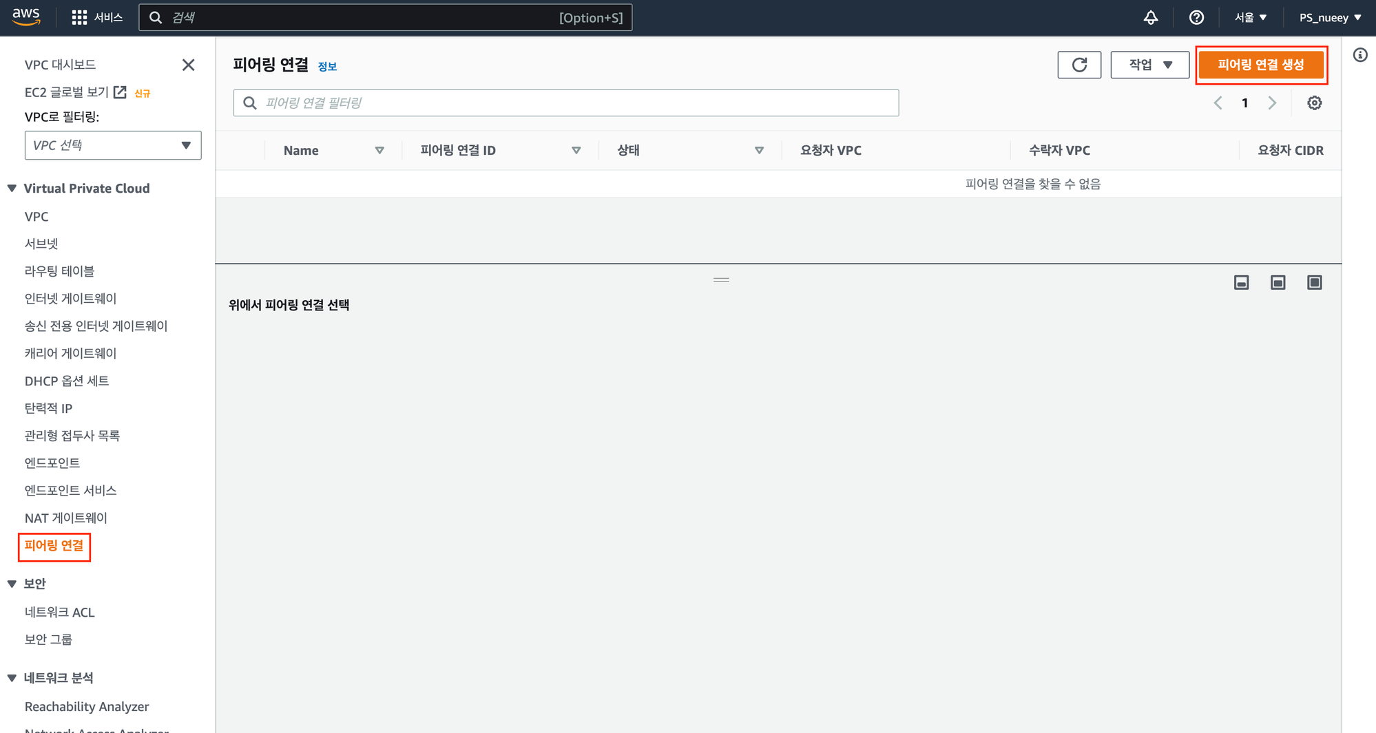 피어링 연결 생성 버튼을 클릭하고 연결할 vpc 를 선택한 뒤 피어링 연결 생성을 한다.