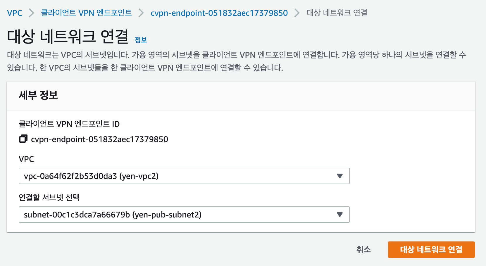 먼저 대상 네트워크 연결에서 연결할 yen-vpc2 와 서브넷을 선택한다.
