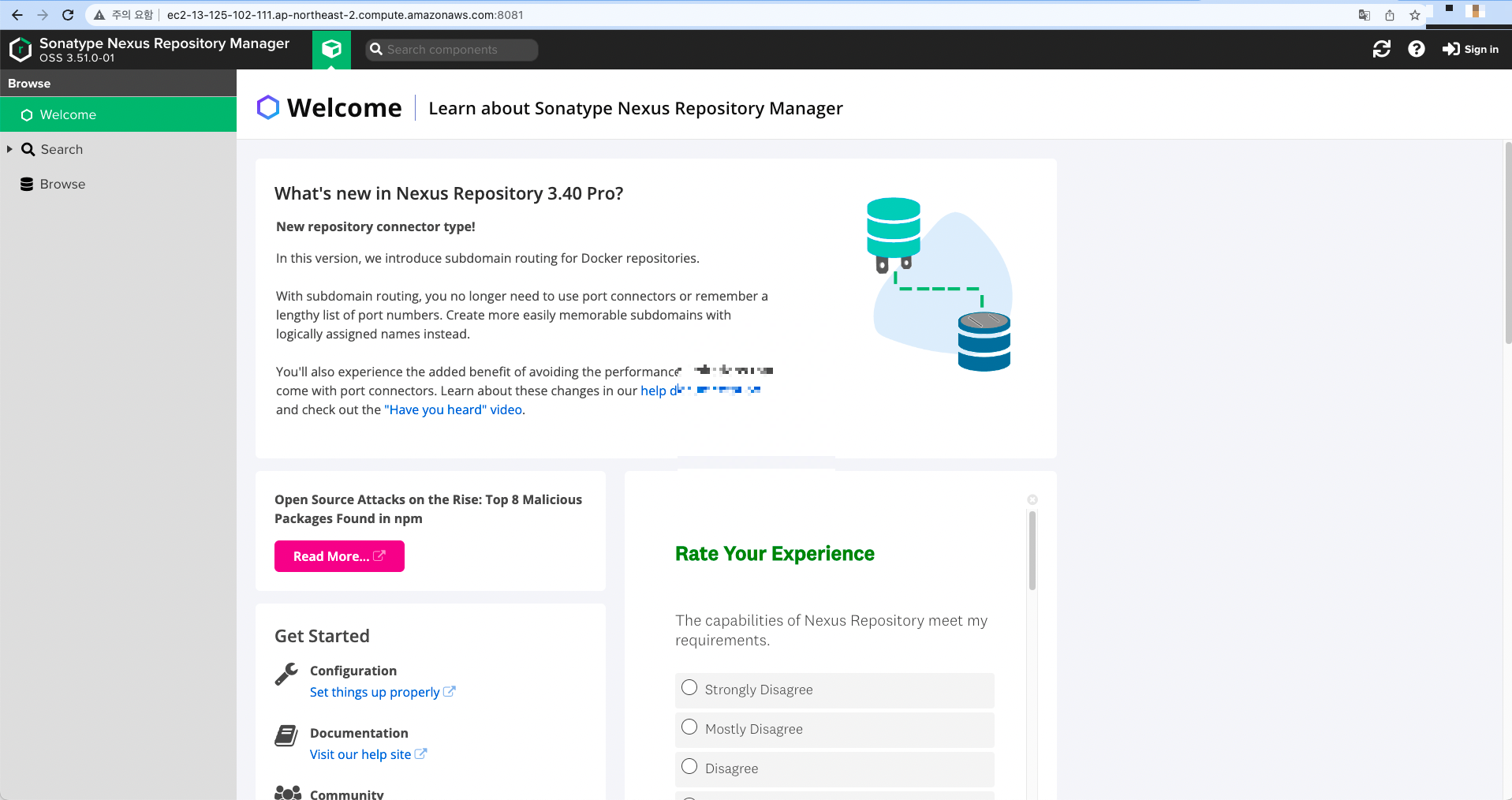 EC2 인스턴스 도메인의 nexus 기본 포트인 8081 포트로 접속해보면 정상적으로 nexus 화면이 뜨는것을 확인할 수 있다